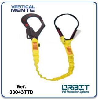 Eslinga de detención de caídas sencilla, fabricada en reata tubular con sistema interno de absorción con gancho dieléctrico de 65mm de apertura. Norma ANSI Z359.3-2017