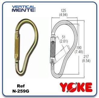Es un gancho carabinero tipo pera de gran apertura con seguro automático de dos pasos, Los conectores Yoke están diseñados para ofrecer una unión segura y confiable entre el usuario y los demás componentes de un sistema de protección contra caídas. Cada uno de ellos es diseñado, fabricado, instalado según la reglamentación vigente.
