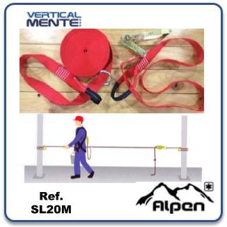 Linea de vida horizontal móvil para distancias menores a 20 mts con cinta de nylon de 2 pulgadas con resistencia de 45 Kn anilla de anclaje de 22 Kn y rache en acero de 50 Kn.