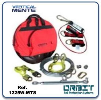 Desplazamiento horizontal, consta de un cable de diametro 5/16, gancho con paquete de absorción de energía en uno de sus extremos con abertura a 65mm y en el otro extremo cierre final para evitar que salga accideltalmente el freno,tensor en acero HG226, mosquetón de 51 mm de abertura, perros de 3/8 [2], eslinga de 180 cm [2]. TIE OFF de 1,5 mts [2], estuche, certificación ANSI 2359-1 2007 ANSI A10.32, 2004.