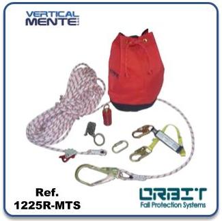 Sistema de protección de caídas, este kit consta de una cuerda de 13 mm, gancho estructural en uno de sus extremos de abertura a 25, 65 o 110 mm para usar con pértiga y en el otro extremo cierre final para evitar que se salga el freno, contrapeso de 3,6 lbs con regulador, arrestador de caída ( rope grab), eslinga con absorbedor de energía de 90 cm, TIE OFF de 1,5 mts, mosquetón Seg/Aut, estuche, certificación ANSI 2359-1 2007 ANSI a 10.32, 2004. De 20 a 50 metros.