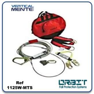 Desplazamiento horizontal, consta de un cable de diametro 5/16, gancho con paquete de absorción de energía en uno de sus extremos con abertura a 65mm y en el otro extremo cierre final para evitar que salga accideltalmente el freno,tensor en acero HG226, mosquetón de 51 mm de abertura, perros de 3/8 [2], eslinga de 180 cm [2]. TIE OFF de 1,5 mts [2], estuche, certificación ANSI 2359-1 2007 ANSI A10.32, 2004.